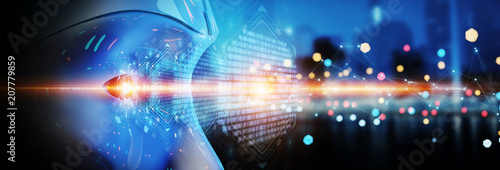 Obraz premium Cyborg head using artificial intelligence to create digital interface 3D...