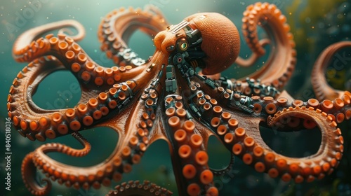 Obraz premium Cyborg Octopus Warrior A captivating 3D visualization of a cyborg octopus warrior, blending aquatic grace and advanced technology in a mesmerizing underwater realm, showcasing the power and beauty of