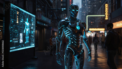 Naklejka premium Cyborg overlooking futuristic city at night.