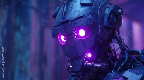 Fototapeta premium Cyborg robot with glowing eyes, in a dimly lit urban setting, observing. Stock photo use