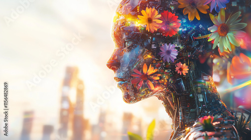 © Nikita Starodubtsev, Fototapeta premium Cyborg with Floral Design in Sunset