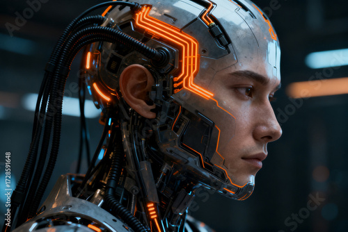 Fototapeta premium Cyborg with illuminated neural circuitry and advanced mechanical features in...