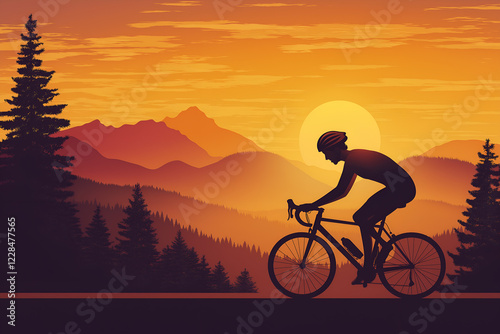 © Aa, Obraz premium Cycling enthusiast vector with a bike, helmet, and hilly background. Vector illustrations concept