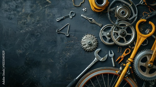 Naklejka premium Cycling Essentials Flat Lay: Bicycle Components and Tools on Black Surface