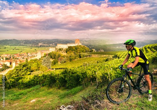 © isaac74, Fototapeta premium Cyclist admires the Soave castle views.