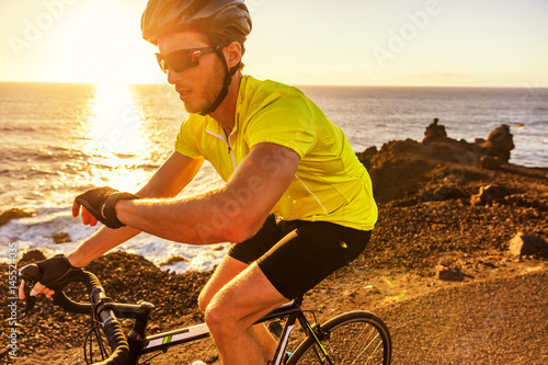 © Maridav, Fototapeta premium Cyclist biking looking at smartwatch while riding road bike. Athlete biker using activity tracker gps fitness watch on biking workout in sunset. Sports man using his watch app for fitness tracking.