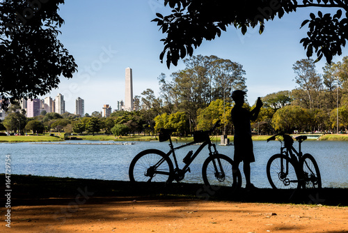 Fototapeta premium Cyclist by the lake in Ibirapuera Park, Sao Paulo, Brazil, taking photos.