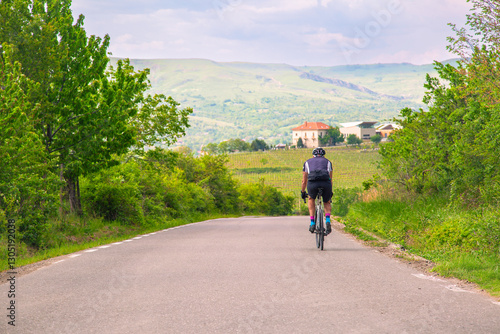 Fototapeta premium Cyclist Enjoying a Scenic Ride Through a Rural Road Surrounded by Lush Greenery and Hills