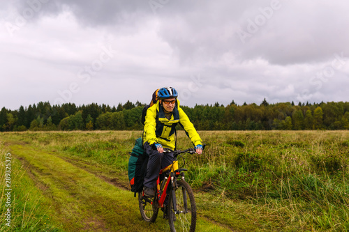 Naklejka premium cyclist hiker rides on a dirt road through a field