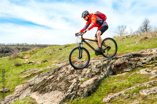 Fototapeta premium Cyclist in Red Jacket Riding Mountain Bike Down Rocky Hill. Extreme Sport and...
