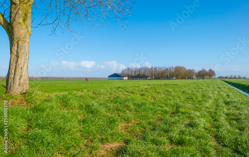 © Naj, Obraz premium Cyclist on a path in a green field below a blue sky in sunlight in winter