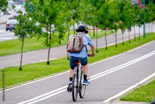 © licvin, Obraz premium Cyclist ride on the bike path in the city Park