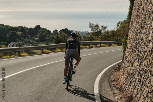 Fototapeta premium Cyclist rides along scenic coastal road. Enjoy the freedom of the open road...