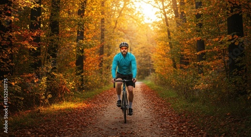 © Timur, Fototapeta premium Cyclist rides along wooded path in autumn forest setting