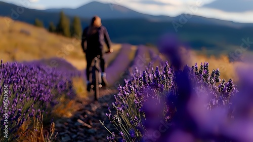 © Yuliia, Naklejka premium Cyclist riding mountain bike through blooming lavender fields with scenic mountain landscape in background during golden hour.