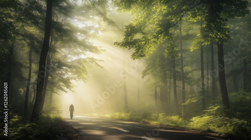 © Pixora Labs, Obraz premium cyclist riding on the road in a forest with mist with dense trees