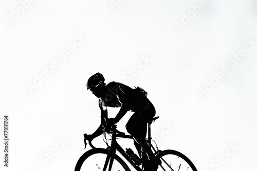 © Qayyum, Fototapeta premium Cyclist silhouette cameo, mid-pedal, dynamic positioning, solid white background.