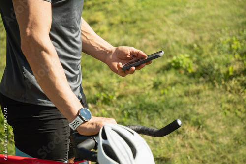 Fototapeta premium Cyclist standing with bicycle checking smartphone during break outdoors