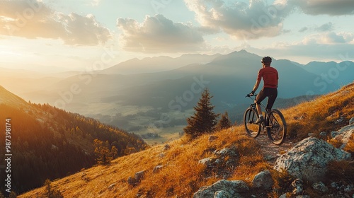 Fototapeta premium Cyclist taking a break on a mountain trail, with ample space in the scenic...