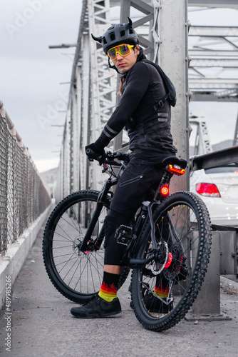 Fototapeta premium Cyclist with professional equipment riding a bike in the street