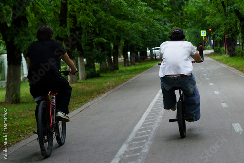 © Nariman, Fototapeta premium Cyclists enjoying a leisurely ride on a tree-lined path in a city park during a sunny day