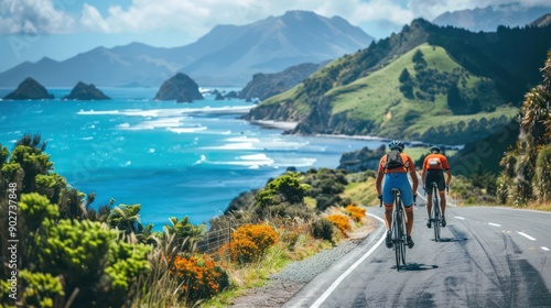© Thanaporn, Fototapeta premium Cyclists on a scenic coastal road, perfect for active and adventurous transport backgrounds.