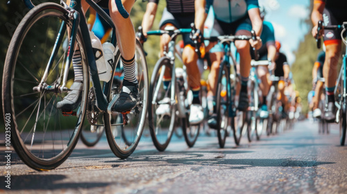 Fototapeta premium Cyclists participating in a charity ride on a sunny day down city streets promoting community health and fundraising efforts