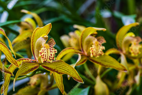 © Nakornthai, Obraz premium Cymbidium tracyanum, Beautiful wild orchid in tropical forest.