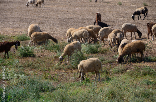 © Михаил Шорохов, Fototapeta premium Cyprus Long-Eared Goats Grazing with Sheep in Pasture