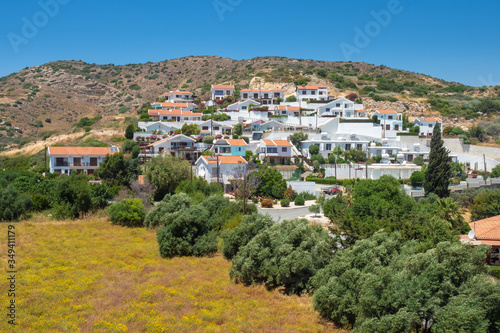© Grispb, Fototapeta premium Cyprus. The village of Pissouri on the background of the hill. Resort place in Cyprus. Village of white houses in Cyprus. Vacation in the Mediterranean. Seaside resort.