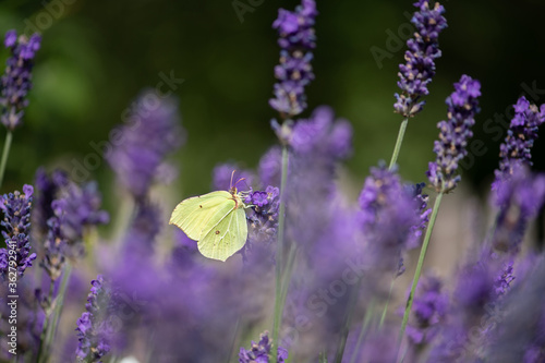 © Werner, Naklejka premium cytrynowo-żółta siarka siedzi na fioletowym kwiecie lawendy i wysysa słodkie soki warzywne swoim pniem, makro i selektywną ostrością.