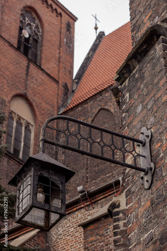 Fototapeta premium Czarna lampa na ścianie starego kościoła