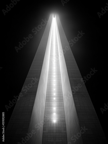 © Silent26, Fototapeta premium Czarne i białe zdjęcie przedstawiające rozświetlony pas wznoszący się w ciemność, tworzący iluzję nieskończonej, futurystycznej konstrukcji lub przejścia.