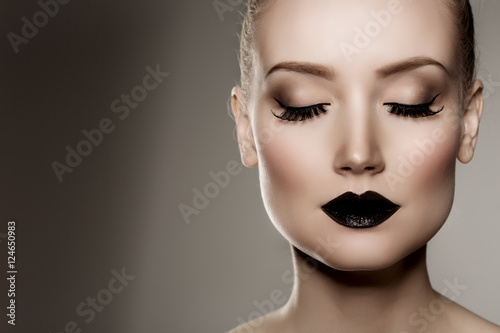 Fototapeta premium Czarne usta. Makijaż na Halloween. Luksusowa piękna kobieta z ciemnym l
