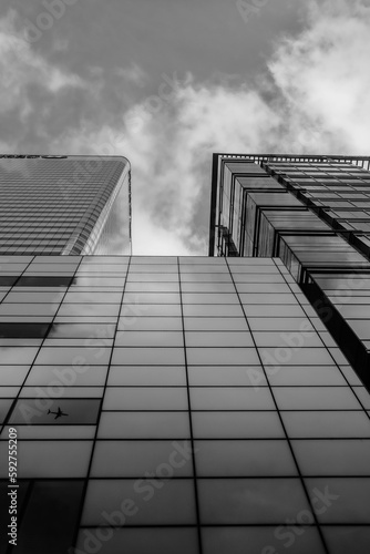 Fototapeta premium czarno białe, w oknach wieżowca odbijający się lecący samolot