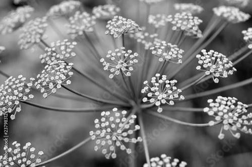 Fototapeta premium Czarno-białe zdjęcie kwiatostanu. Koper włoski złożony. Koper (łac. Anethum)...