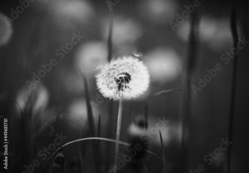 Naklejka premium Czarno-biały obraz białego, puszystego, jasnego kwiatu mniszka lekarskiego rosnącego na łące wśród ciemnej trawy. Natura.