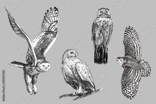 Obraz premium Czarno-biały szkic odręczny, rysunek sowy śnieżnej