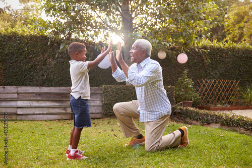 © Monkey Business, Fototapeta premium Czarny dziadek bawi się z wnukiem w ogrodzie, na całej długości