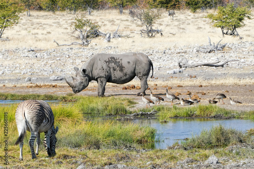 Naklejka premium czarny nosorożec, zebry, egipskie gęsi w Namibii