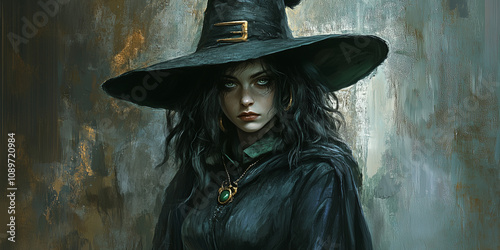 Fototapeta premium Czarownica w pełnym stroju, z kapeluszem o szerokim rondzie i mrocznym uśmiechem.