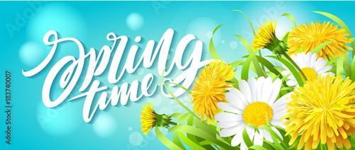 © Dushkapampushka, Obraz premium Czas wiosny napis na tle świeżej wiosny z trawą, mniszek lekarski i stokrotki.