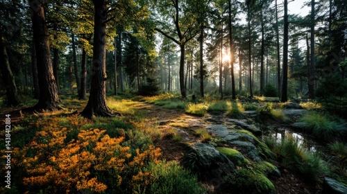 © Iurii, Obraz premium Czech forest edge with young trees and sunlit undergrowth in golden light