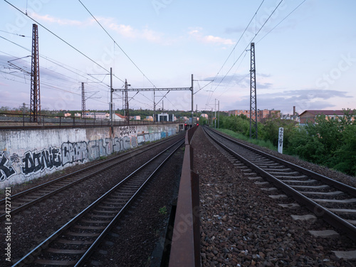© svetjekolem, Obraz premium czech railway tracks at sunset and in the background is prague architecture in spring 2020