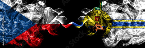 Fototapeta premium Czech Republic, Czech vs United States of America, America, US, USA, American, Little Rock smoky mystic flags placed side by side. Thick colored silky abstract smoke flags.