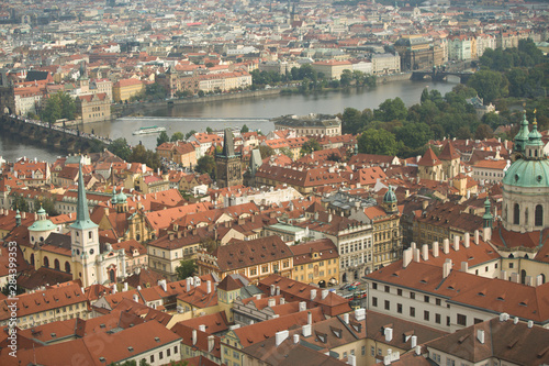 Obraz premium CZECH REPUBLIC, Prague. View of Prague and the Charles Bridge from the Bell Tower, St. Vitus Cathedral.