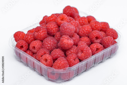 Obraz premium Czerwone, dojrzałe, owoce malin w plastikowym pojemniku na białym tle