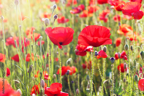 Obraz premium Czerwone maki pole zbliżenie, naturalne tło, stonowanych
