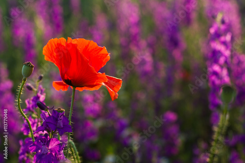 © icephotography, Fototapeta premium Czerwone maki w polu fioletowych kwiatów o zachodzie słońca