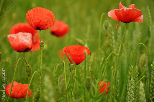 © violart, Fototapeta premium Czerwone maki w polu pszenicy